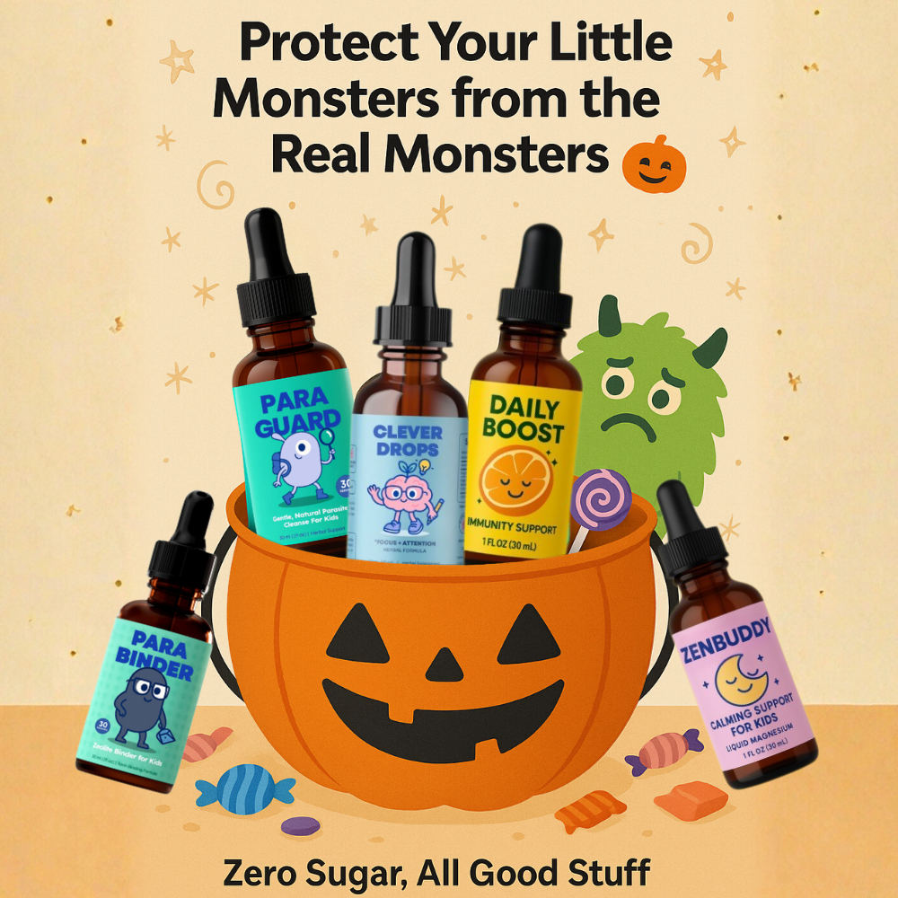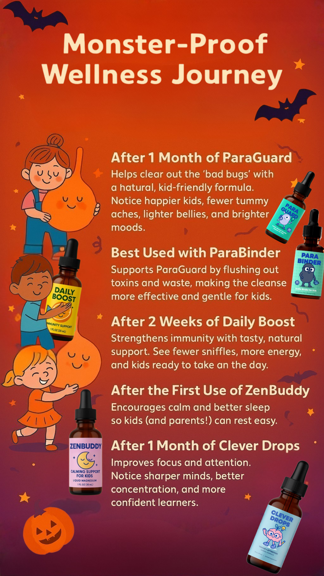 From fewer tummy aches to stronger defenses and calmer nights, our Monster-Proof Bundle has your kids covered. Daily Boost powers up their immune shield all season long, ZenBuddy eases worries and promotes restful sleep, and Clever Drops sharpen focus without the sugar crashes. The natural way to keep your little monsters feeling their best - this Halloween and beyond!”